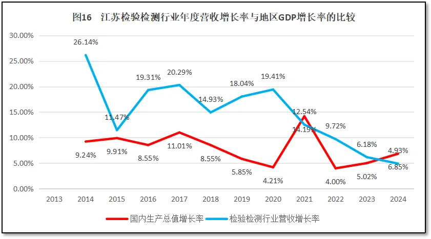 由图15可见,总体来说,江苏省检验检测机构年度营收总额的增长率在多数年份远高于当地GDP的同比增长率(在2021年除外)。但随着时间推移,江苏省检验检测机构年度营收总额增幅逐渐下降,2024年度已然出现检验检测行业营收总额增长率低于当地GDP增长率的现象,说明目前江苏省检验检测行业发展步伐一定程度上已经落后于区域经济发展的需要。